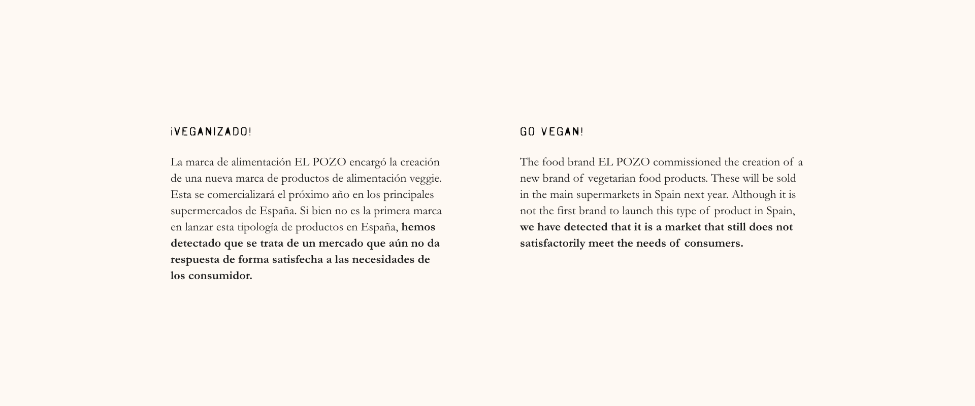 The food brand EL POZO commissioned the creation of a new brand of vegetarian food products. These will be sold in the main supermarkets in Spain next year. Although it is not the first brand to launch this type of product in Spain, we have detected that it is a market that still does not satisfactorily meet the needs of consumers.